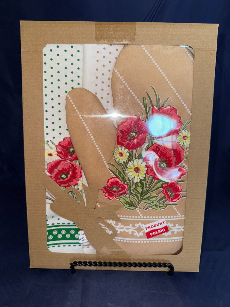 This is a beautiful Beige Poppy Flower with Dots Oven Mitt and Tea Towel Set.