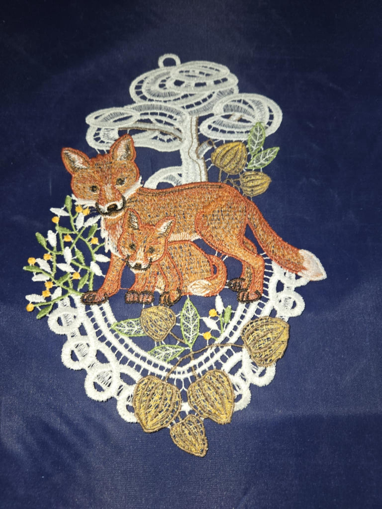 German Lace Linen Fox Mom and Baby Window Wall Hanging