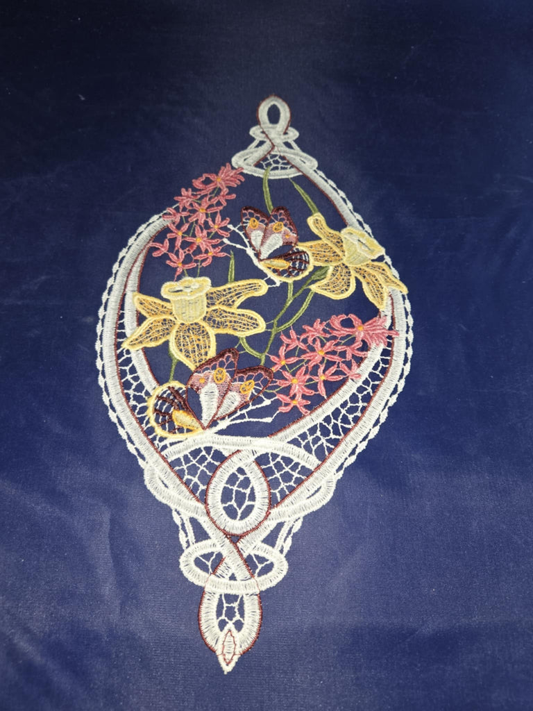 German Linen Lace Daffodils Butterflies in the Garden Window Wall Hanging