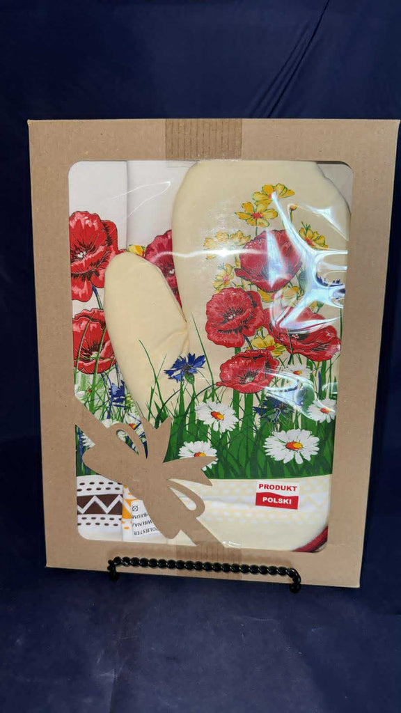 Polish Linen 3-Pc Kitchen Tea Towel, Oven Mitt & Potholder - Cream Oven MItt with Brown and Yellow Tea Towels